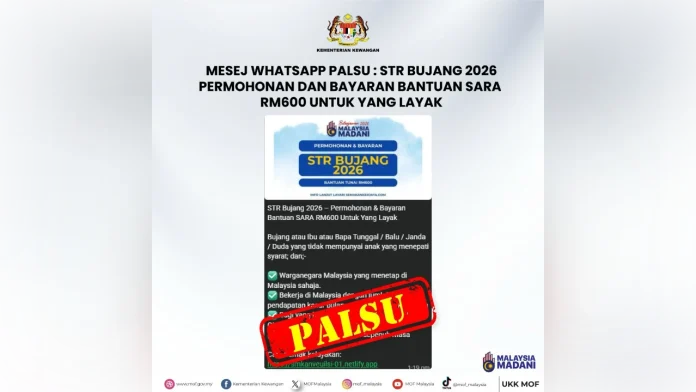 Kementerian Kewangan menafikan mesej WhatsApp tular tawaran bantuan STR dan SARA RM600 untuk bujang, menasihati orang ramai agar hanya merujuk saluran rasmi untuk maklumat sahih.