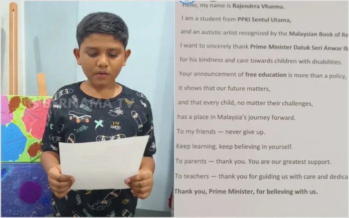 Pelajar autisme Rajendrra Vharma rakam penghargaan kepada PM Anwar Ibrahim atas pengumuman pendidikan percuma untuk pelajar OKU di IPTA.