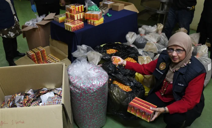 “Kami merampas lebih 500 bungkusan bahan mentah, 23,000 produk separa siap dan 36 unit mesin pemprosesan,” katanya.