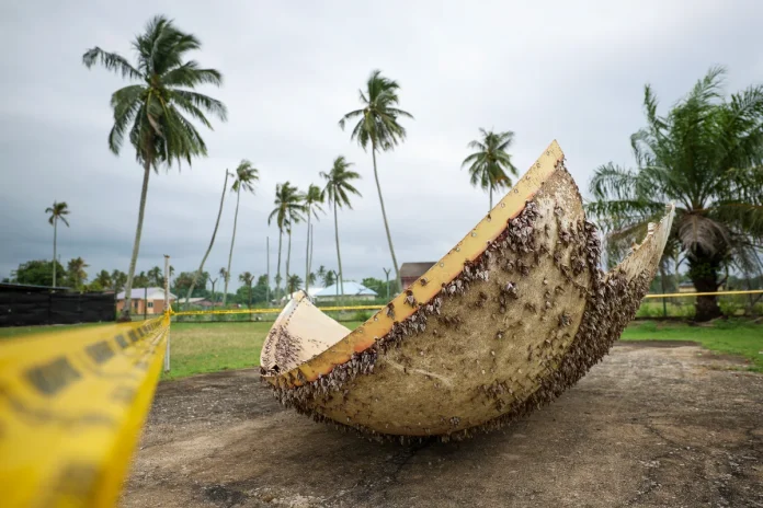 For safety, the barnacle-encrusted debris has been moved to the Nenasi Police Station for temporary storage.