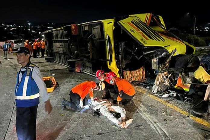 The coach, travelling from the capital Jakarta to Yogyakarta, overturned after hitting a road barrier at an interchange.